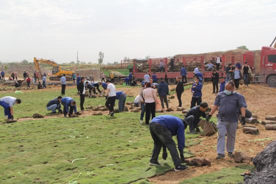 只见大家分工协作,认真地完成每一道工序。有的在平整土地、有的在铺种草皮、有的在浇水,干的热火朝天。在大家的共同努力下,当天袁店南矿山恢复治理区内15000余平方米的草坪铺设铺种完成,为矿山披上了绿衣。